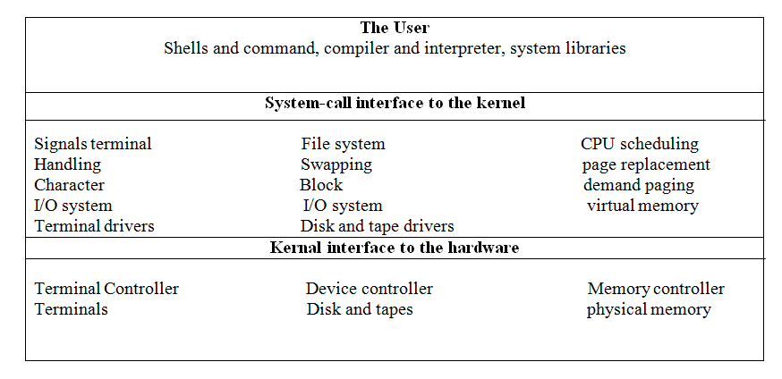 • Kernal: consist of everything below the system call interface and above the physical hardware.